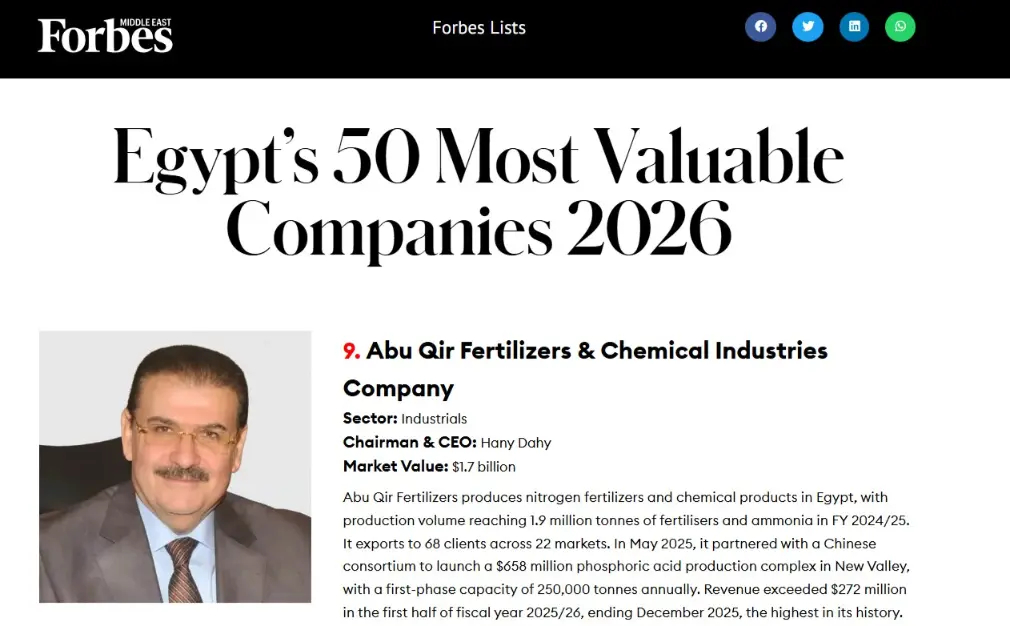 “Abu Qir Fertilizers” has been included in Forbes Middle East Top 50 Public Companies in Egypt for the year 2026