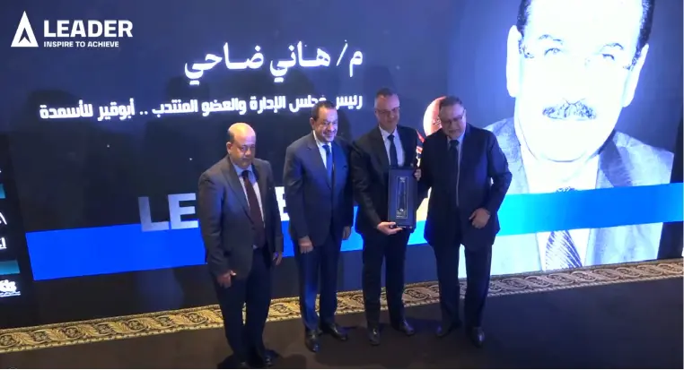 لحطة تكريم احتفالية LEADERS AWARD المهندس هاني ضاحي رئيس مجلس الإدارة والعضو المنتدب لشركة ابو قير للأسمدة والصناعات الكيميائية بجائزة بناة جسور المستقبل نحو التنمية المستدامة خلال 2025